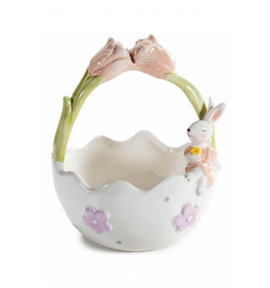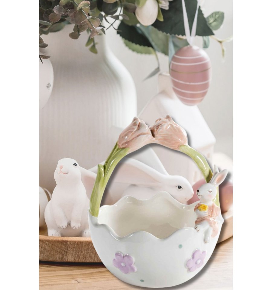 Realizat din ceramica fina si atent finisata, cosul impresioneaza prin detaliile in relief si designul sau jucaus, prin paleta de culori pastelate ce aduc un aer cald si primavaratic, perfect pentru decorarea mesei festive sau a casei.