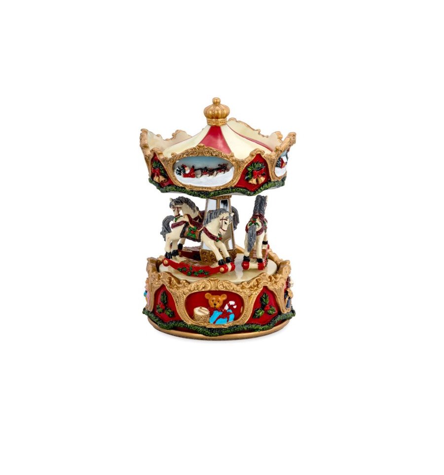 Redescopera magia si farmecul copilariei cu acest carusel muzical deosebit, un decor de sarbatoare plin de emotie si nostalgie. Realizat din polirasina de inalta calitate, cu detalii minutios lucrate si accente aurii elegante, caruselul prinde viata in timp ce reda melodia clasica "Jingle Bells", aducand instant bucurie si spiritul Craciunului in orice incapere.