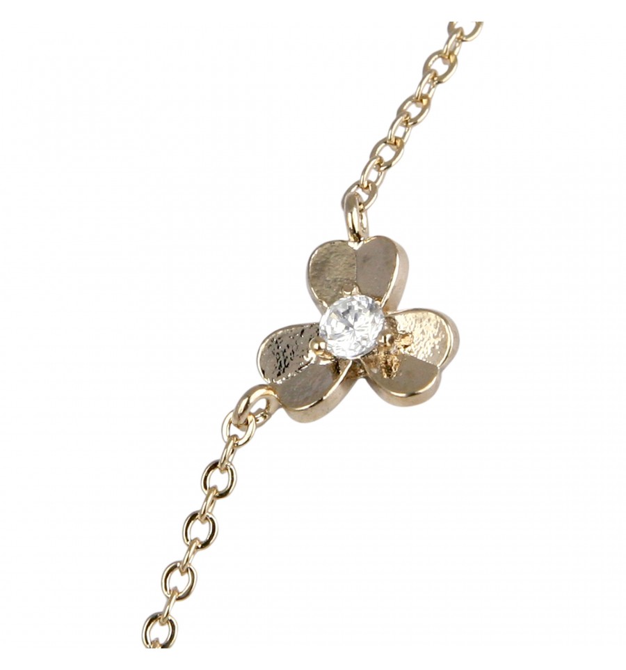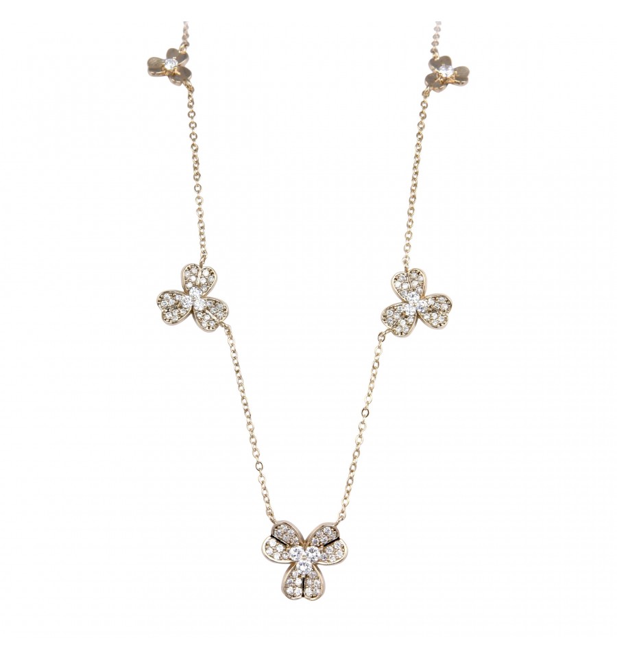 Acest colier splendind este realizat dintr-un aliaj non-alergic, cu o nuanta de auriu patinat si este decorat cu 3 trifoi formati din mici cristale Swarovski albe. Este o bijuterie rafinata care acompaniaza perfect o rochie de seara. Poate fi completata cu celelalte doua bijuterii din set: cerceii si inelul, pentru un aspect plin de stralucire.