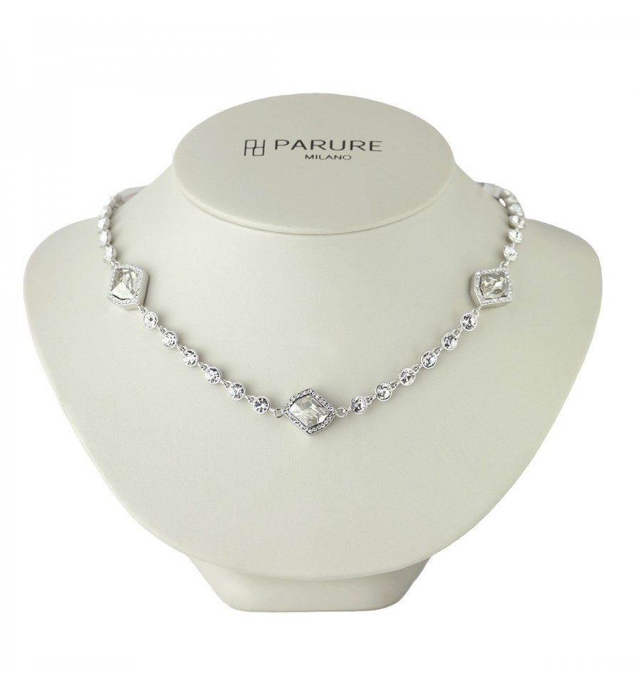 Mai mult ca oricand, in cea mai fericita zi din viata unei femei, stralucirea si rafinamentul sunt cuvintele cheie. Acest colier oferit de Luxury Gifts va poate invalui cu ambele atribute. Stralucirea ii este data de cristalele Swarovski™ de diferite marimi, dar si de faptul ca este rodiat, pentru o mai buna rezistenta in timp. Este un model care se poarta la baza gatului, stil care avantajeaza pe oricine si care este deosebit de chic si elegant.