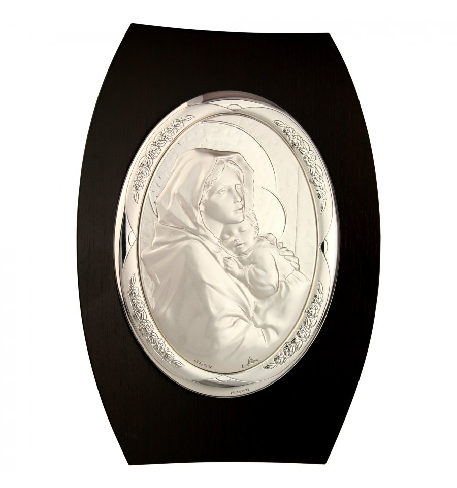 Acest obiect este mai mult decat o icoana! Este un model deosebit, care indeplineste pe langa apropierea de divinitate si o functie estetica, fiind foarte elegant. Icoana care o infatiseaza pe Fecioara Maria alaturi de pruncul Iisus este argintata cu foita de argint 925 si este fixata pe un suport din lemn wenge, lemn nobil si atent lucrat, de culoare neagra