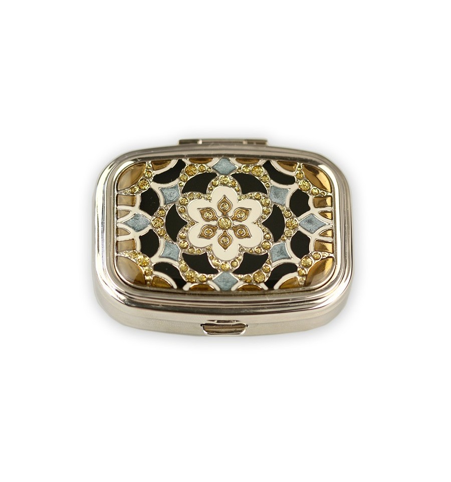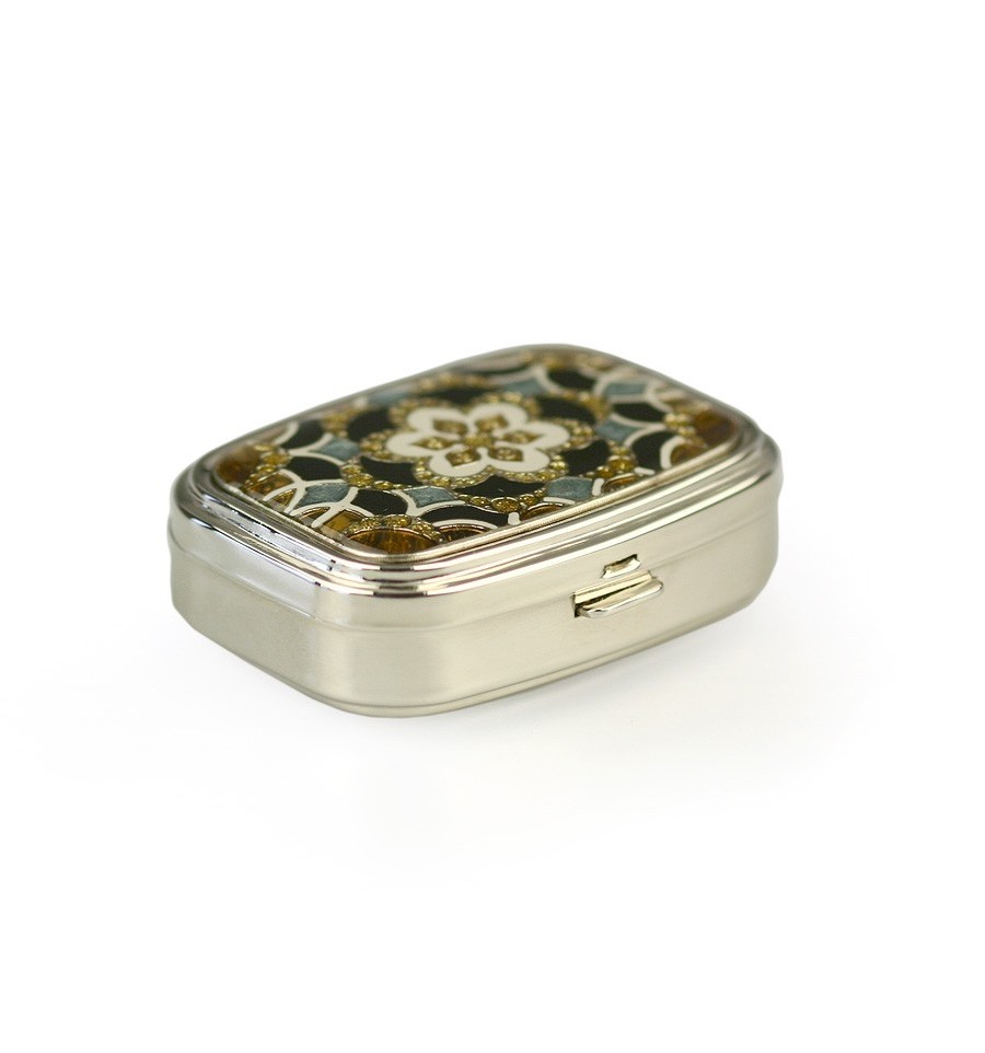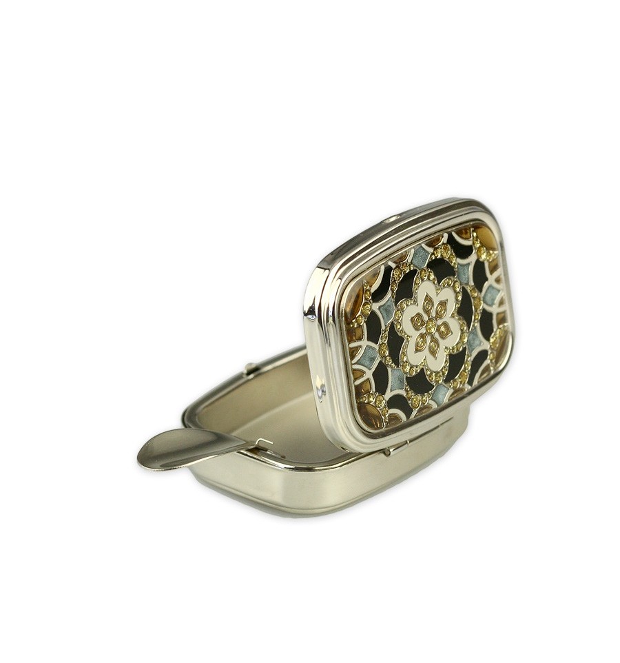 Scrumiera pentru poseta, decorata cu sidef si cristale. Un accesoriu foarte util ce poate fi folosit in orice ocazie si poate fi oferit cadou cu mare usurinta. Dimensiuni: 5,5x4cm Ambalaj:cutiuta din carton panzat bleumarin Momentan este disponibila doar in varianta topaz cu negru.