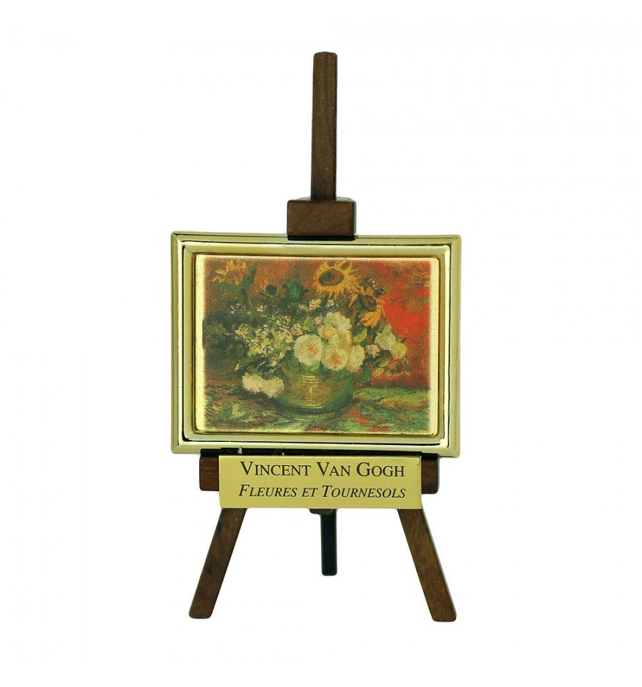 Tablou sevalet "Floarea soarelui" Van Gogh - litografie pe foita de aur de 23 Kt . Pictura este asezata pe un sevalet ce imita lemnul, alcatuind un cadou superb pentru orice ocazie! Dimensiune litografie: 3x4 cm. Sevaletul poate fi comandat si cu alte reproduceri: "Buchet de primavara" - Auguste Renoir "Surorile" - Auguste Renoir "Buchet de Crizanteme" - Auguste Renoir "Fleurs et Tournesols" - Vincent Van Gogh "Lalele in Vaza" - Auguste Renoir "Vaza cu Margarete" - Vincent Van Gogh